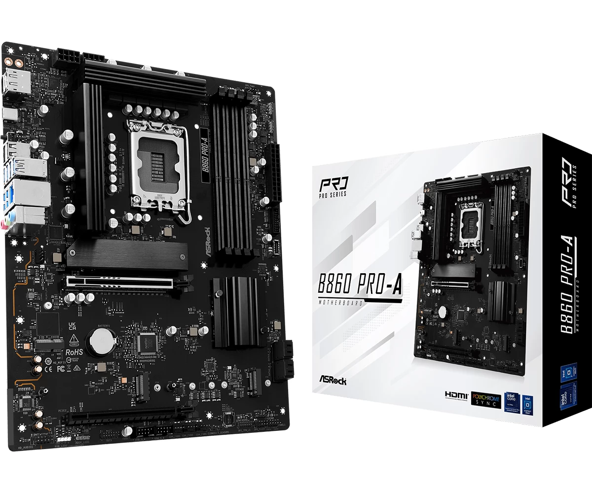 ASROCK B860 PRO-a matična ploča sa LGA-1851 utor, Intel B860 čipset, integrirana video kartica procesora, 4 DDR5 / Cudimm memorijskom utorom (max 256GB). 6 USB 2.0 priključaka, 9 USB 3.0 priključaka.