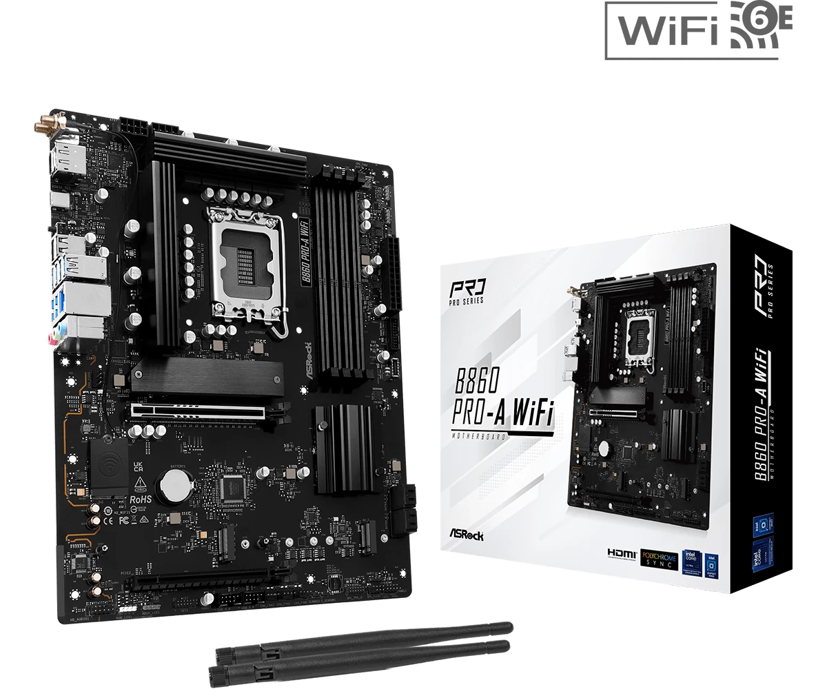 ASROCK B860 PRO-A WiFi matična ploča sa LGA-1851 utičnicom, Intel B860 čipsetom, integrisanom video karticom procesora, 4 DDR5 / CUDIMM memorijskog sudopera (max 256GB). 6 USB 2.0 priključaka, 9 USB 3.0 priključaka.
