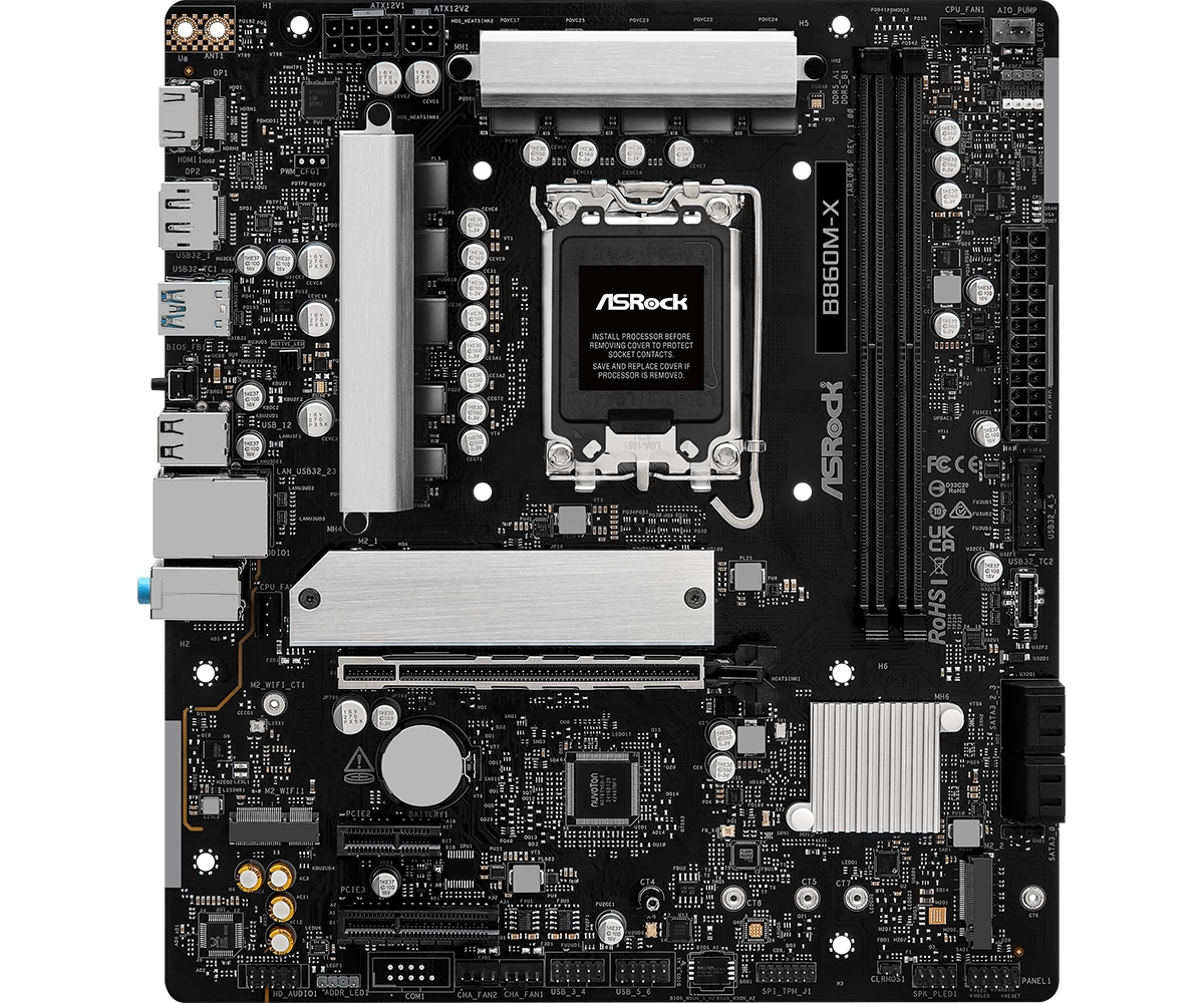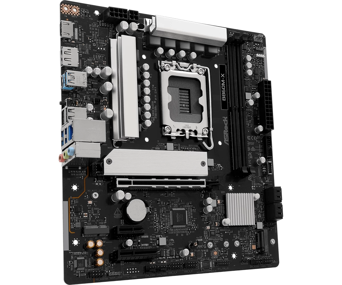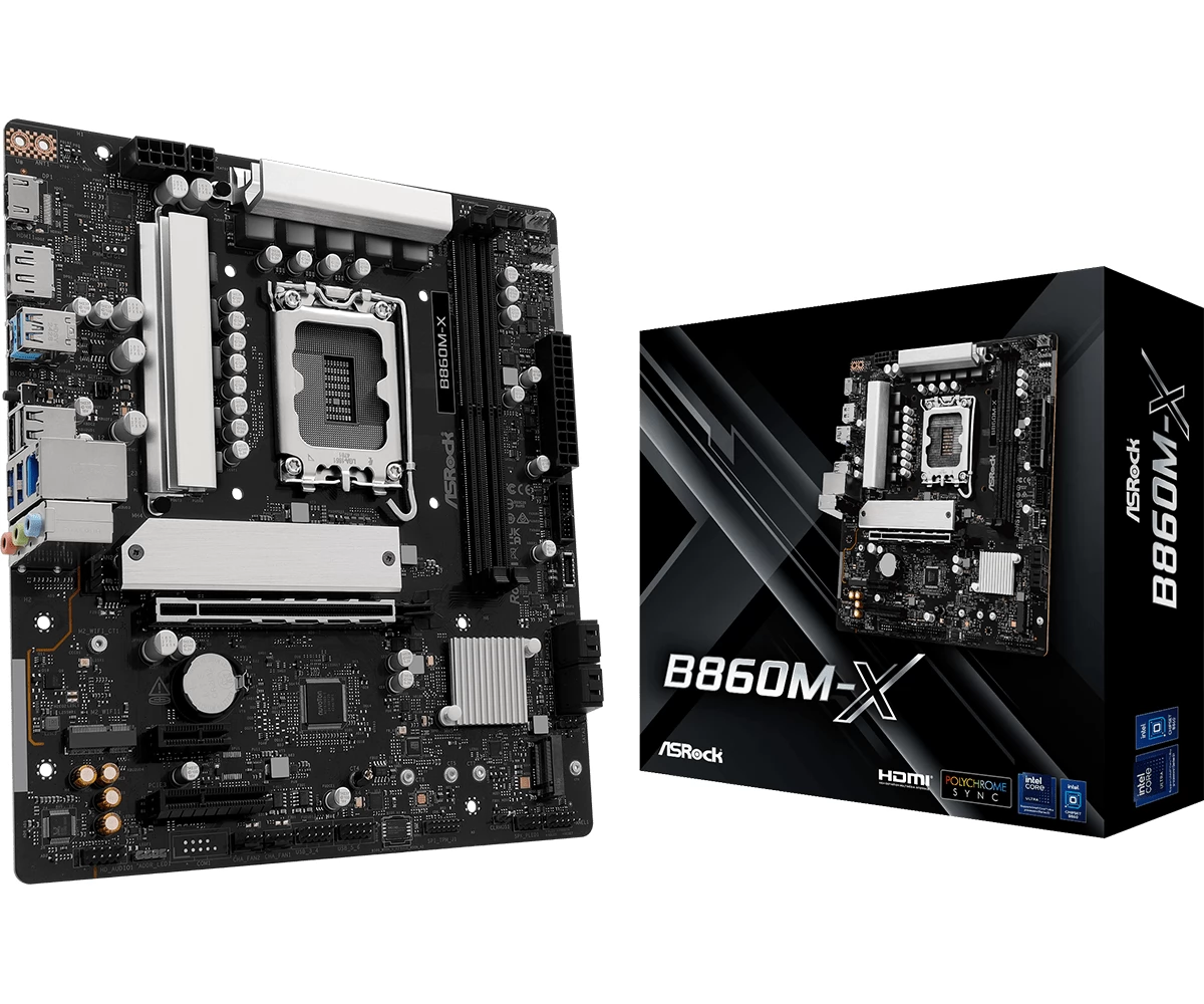 ASROCK B860M-X matična ploča sa LGA-1851 utor, Intel B860 čipset, integrirana video kartica procesora, 2 DDR5 / Cudimm memorijskog utora (max 128GB). 6 USB 2.0 priključaka, 6 USB 3.0 priključaka.