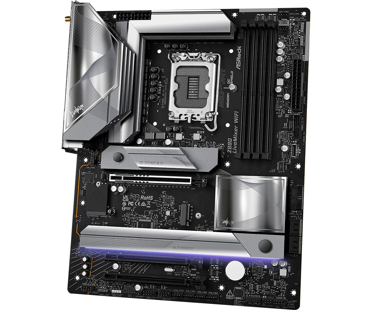 ASROCK Z890 Livemixer WiFi matična ploča sa LGA-1851 utičnicom, Intel Z890 čips, integrirana video kartica procesora, 4 DDR5 memorijskog utora (max 256GB). 4 USB 2.0 portova, 14 USB 3.0 priključaka, 2 USB 3.1 portova.