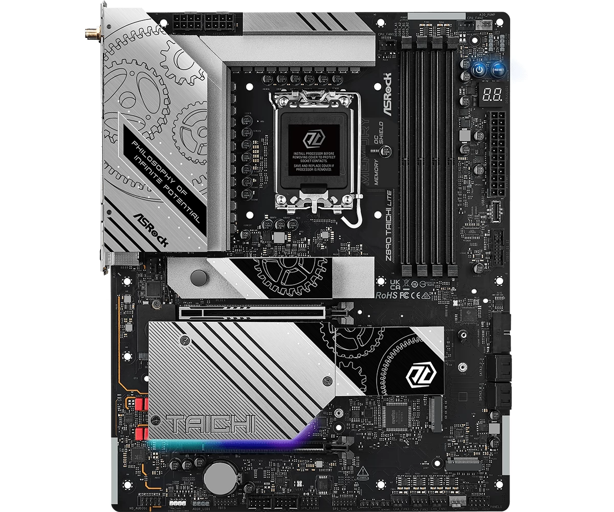 ASROCK Z890 Taichi Lite tip matične ploče sa LGA-1851 sekcijom, Intel Z890 čipset, integrirana video kartica procesora, 4 DDR5 memorijski utor (max 256GB). 6 USB 2.0 priključaka, 8 USB 3.0 priključaka, 4 USB 3.1 portova.