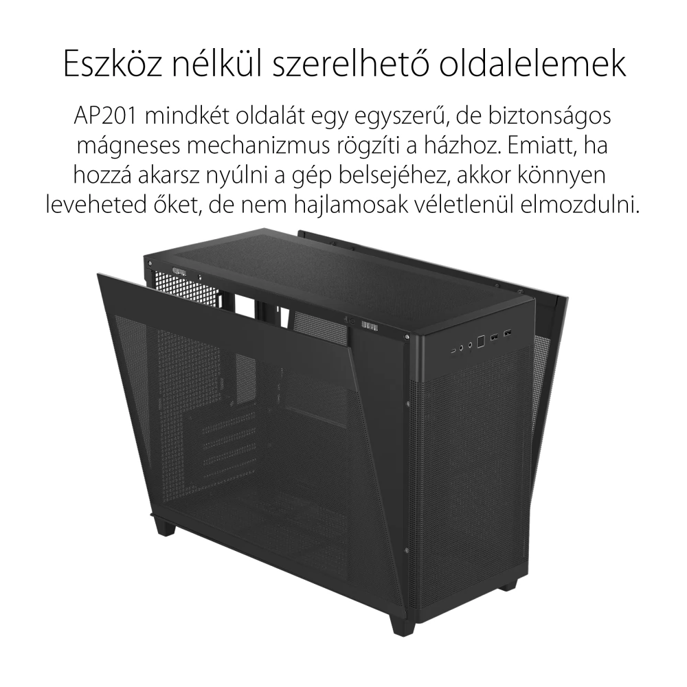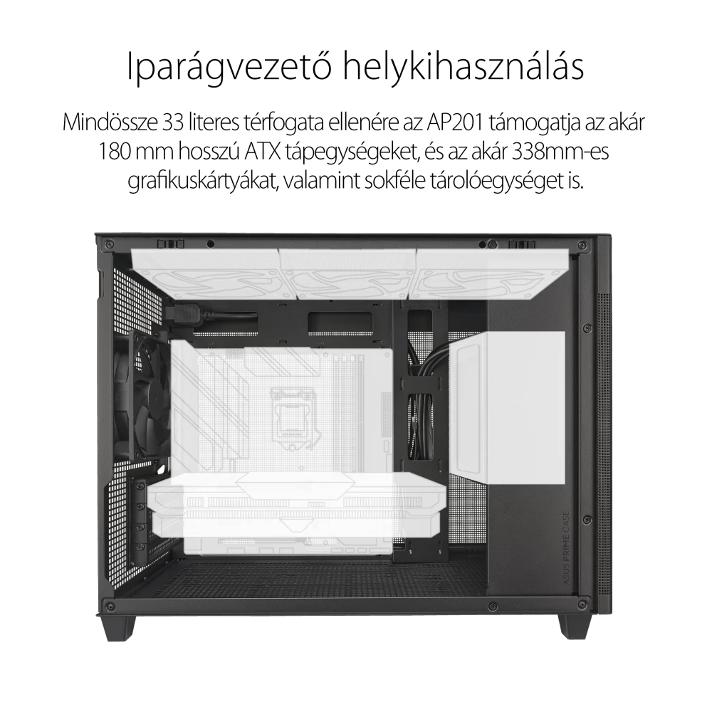 ASUS Prime AP201 je novo microATX rješenje za izradu visokoperformansnih mašina, koje prima 360 mm AIO hladnjake i grafičke kartice dužine do 338 mm, a istovremeno održava zapreminu od samo 33 litre. Perforirane bočne ploče bez alata sa funkcijom filtera osiguravaju dobar protok zraka i jednostavan pristup unutrašnjosti uređaja. Njegov minimalistički izgled može biti vrhunac svakog kućno sastavljenog PC sistema.