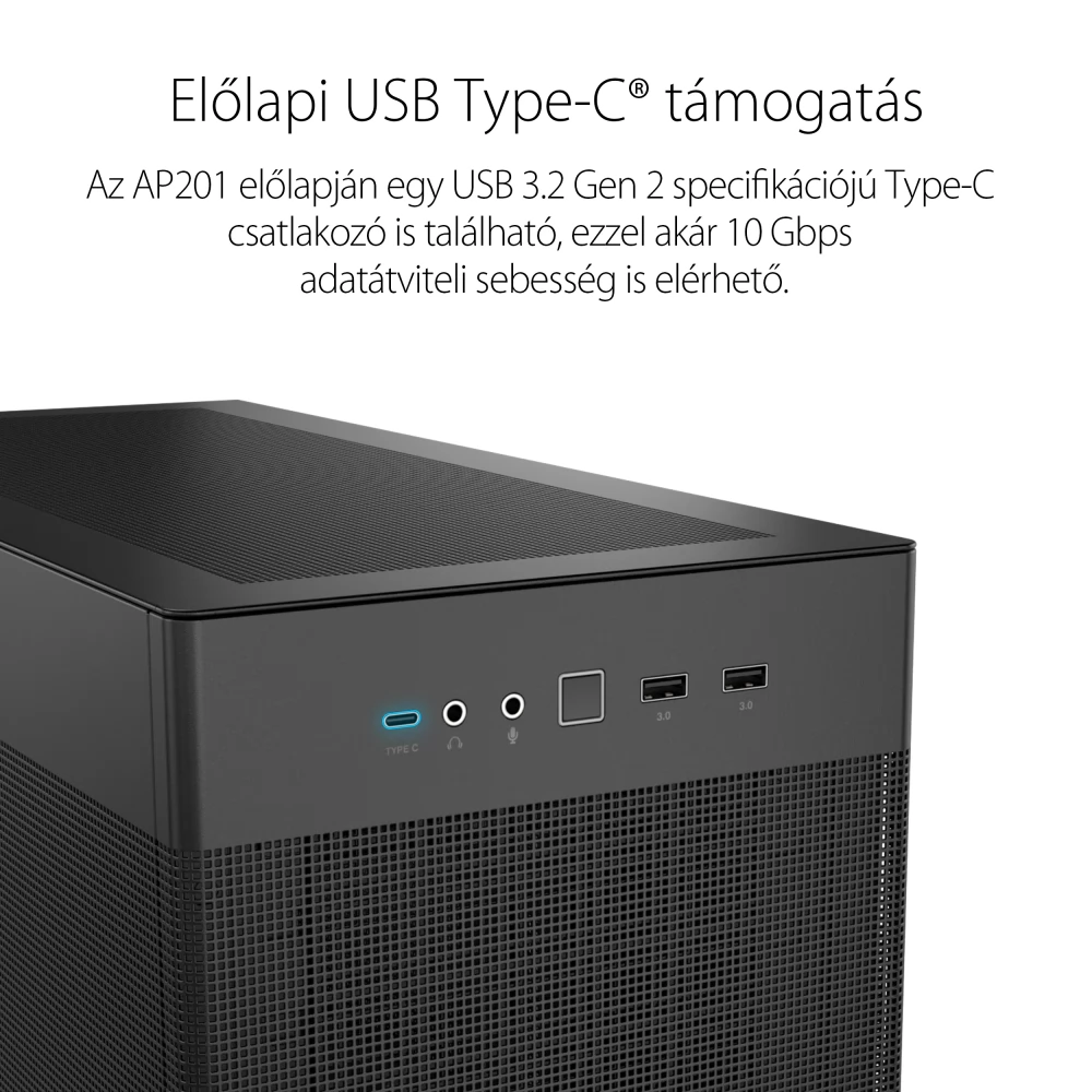Pored dva USB 3.2 Gen 1 Type-A porta, AP201 također ima USB 3.2 Gen 2 specifikaciju Type-C porta na prednjoj ploči. Kompatibilne microATX ASUS matične ploče (kao što su TUF Gaming B660M Plus ili ROG STRIX B660-G) mogu postići brzine prijenosa podataka do 10 Gbps s ovim konektorom.