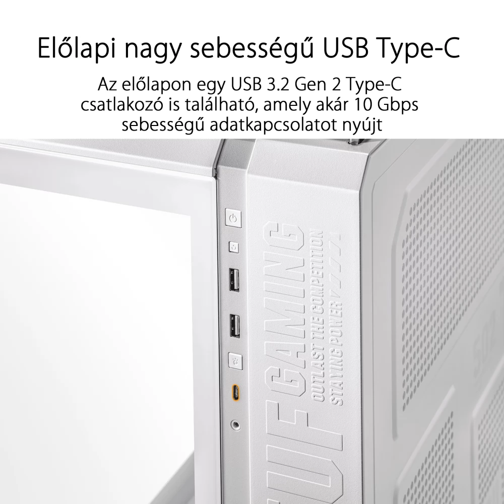 Pored dva USB-A priključka, TUF Gaming GT502 također ima USB 3.2 Gen 2 Type-C priključak na prednjoj ploči, s brzinama prijenosa podataka do 10 Gbps.