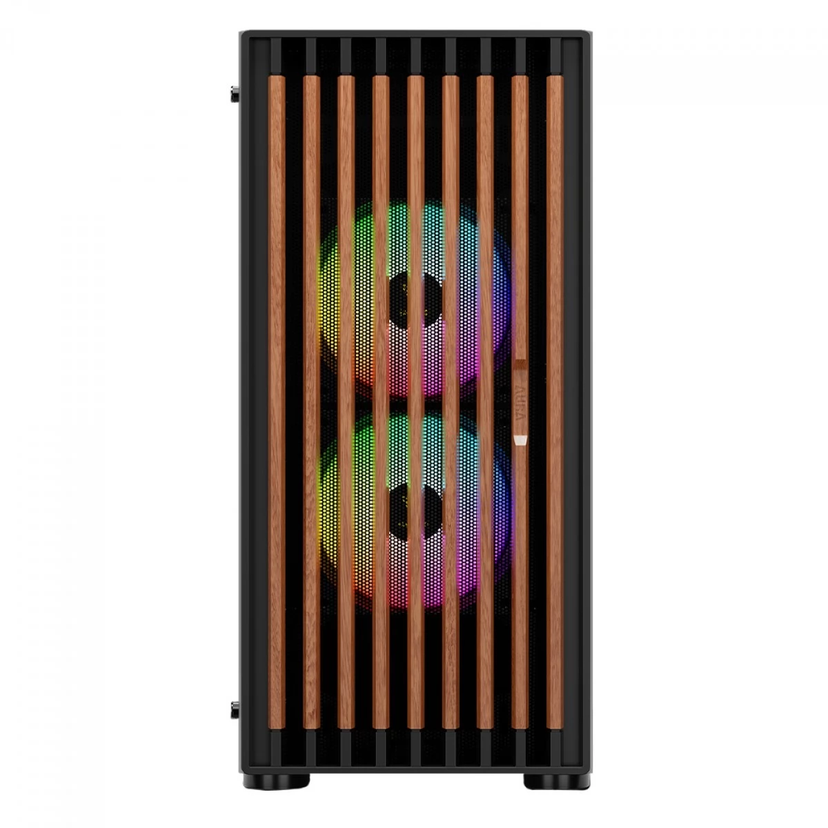 ATX Midi-Tower PC kućište sa prednjom pločom od pravog drveta, bočnom pločom od kaljenog stakla i 3 ugrađena 120 mm ARGB ventilatora.
