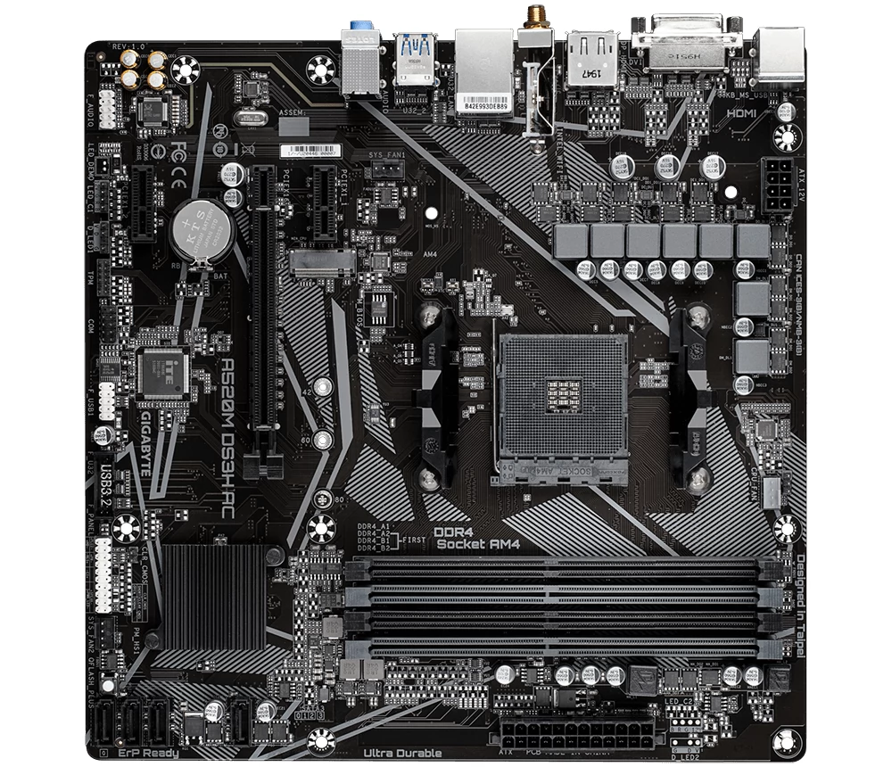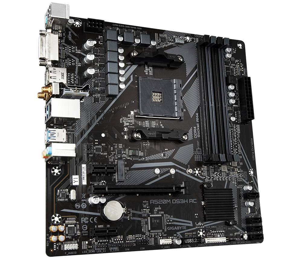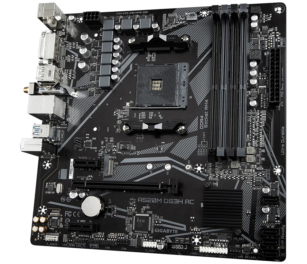 GIGABYTE A520M DS3H AC (Rev. 1.x) Tip matične ploče sa utičnicama sa utičnicama, AMD A520 čipset, integrirana video kartica procesora, 4 DDR4 memorijske utore (max 128GB). 4 USB 2.0 portova, 6 USB 3.0 priključaka, komadi USB 3.1 porta.