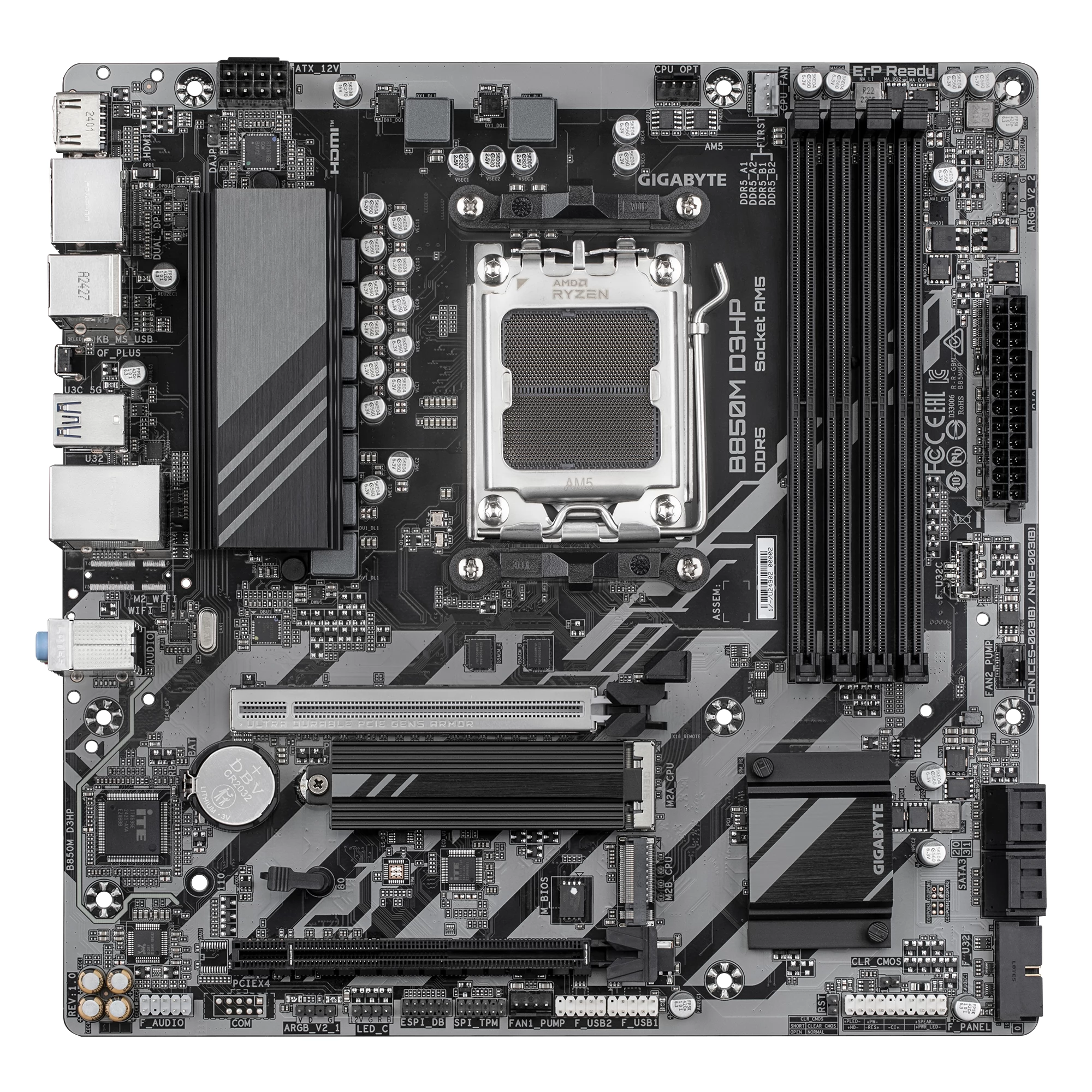 GIGABYTE B850M D3HP matična ploča sa socket-am5 utičnica, AMD B850 čipset, integrirana video kartica procesora, 4 DDR5 / Cudimm memorijska utičnica (max 256GB). 6 USB 2.0 priključaka, 7 USB 3.0 priključaka.