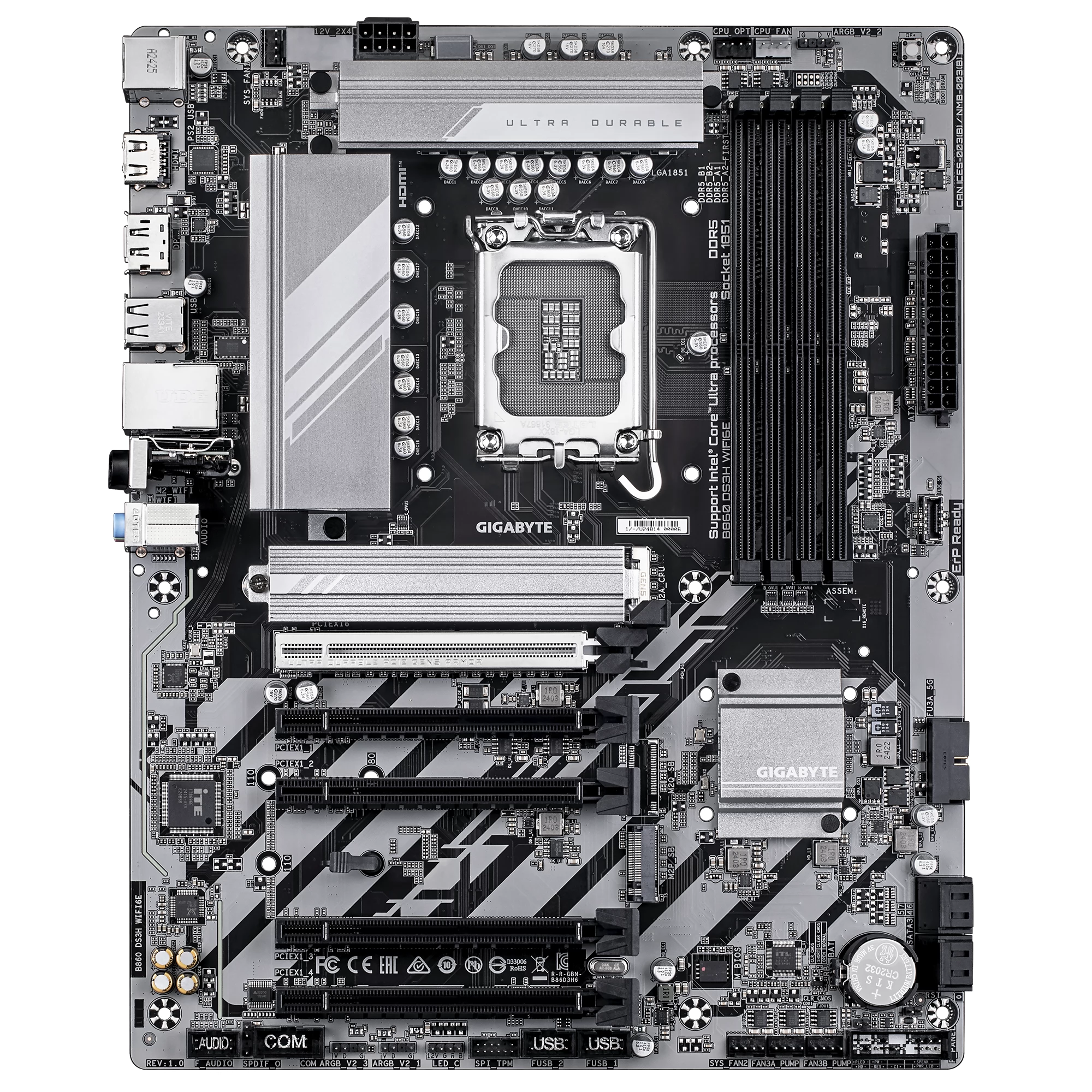 Gigabyte B860 DS3H WiFi6e matična ploča sa LGA-1851 utičnica, Intel B860 čips, integrirana video kartica procesora, 4 DDR5 / CUDIMM memorijske utičnice (max 256GB). 8 USB 2.0 portova, 3 USB 3.0 priključka, 1 USB 3.1 port.
