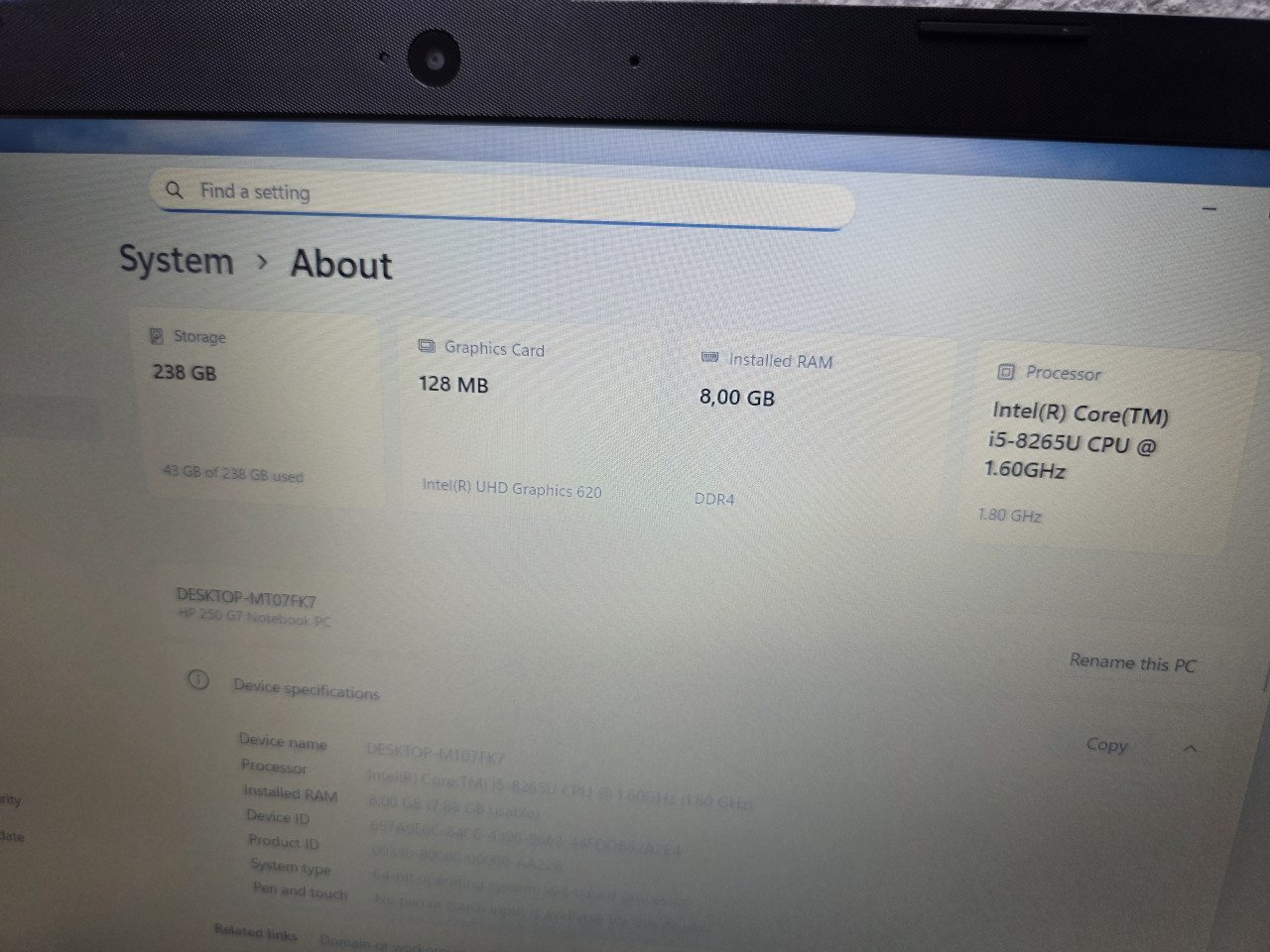 LAPTOP HP 15.6″ FHD i5-8265U 8GB DDR4 256GB SSD