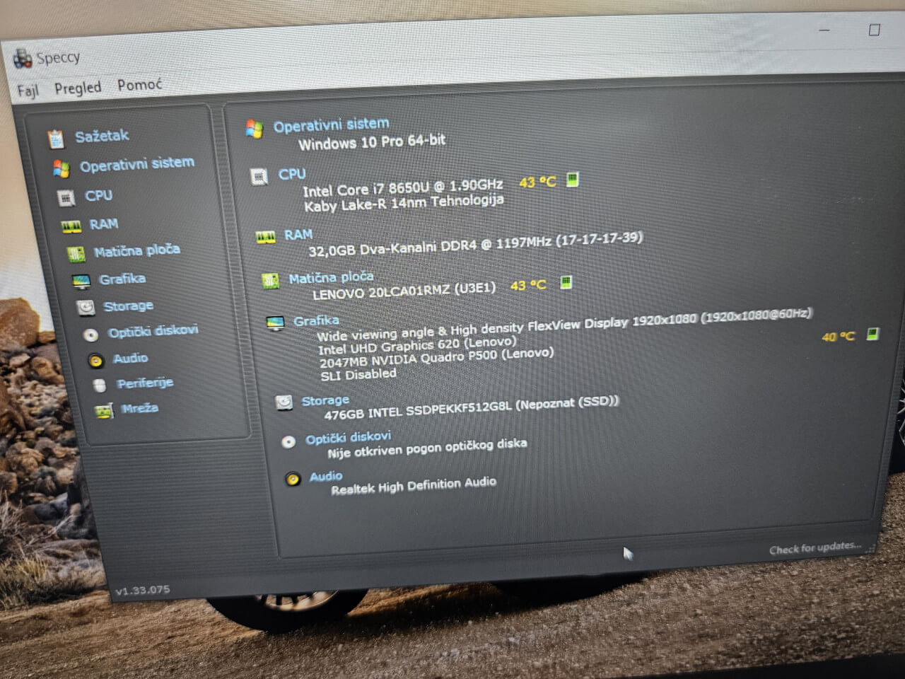 – Integrisana grafika: Intel UHD 620 4GB + NVIDIA Quadro P500 2GB GDDR5