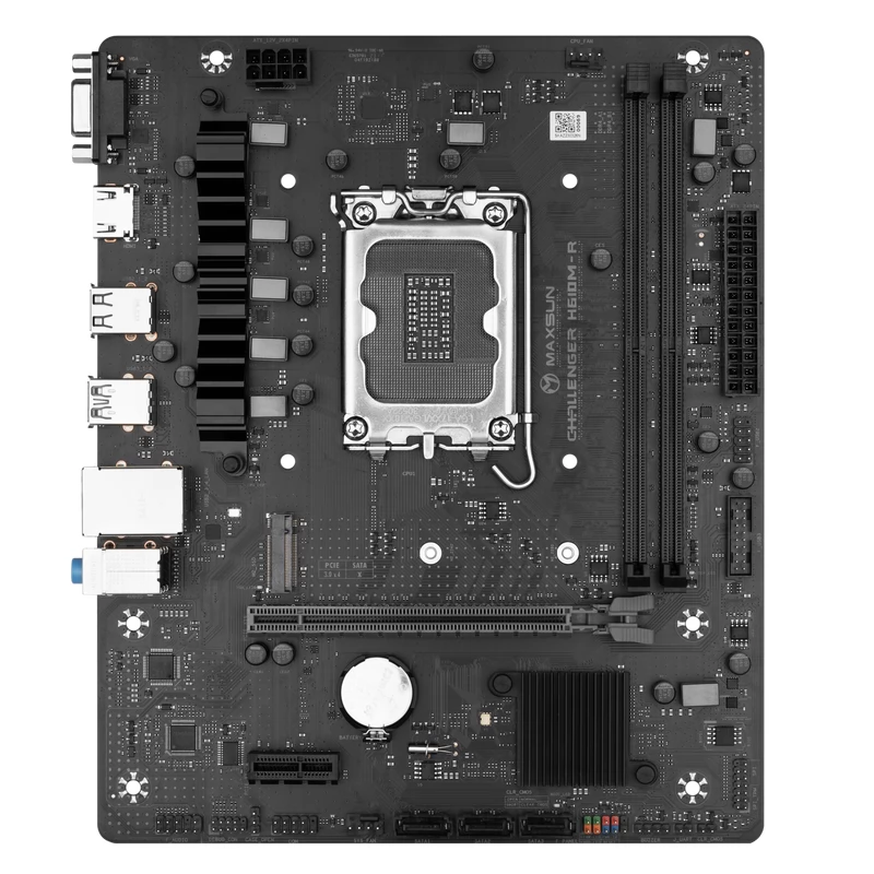 Maxsun Challenger H610M-R V2 matična ploča sa utičnicom LGA-1700, Intel H610 čipset, integrirana video kartica procesora, 2 DDR4 memorijska utora (max 64GB). 6 USB 2.0 priključaka, 4 USB 3.0 priključka, komadi USB 3.1 porta.