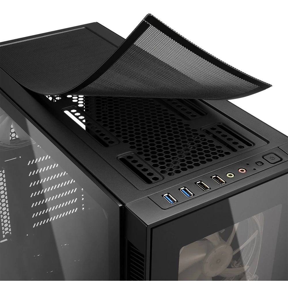 Elegantno crno kućište za računar ATX veličine sa 4 mm debelim kaljenim staklom sa strane i prednje strane, ARGB LED ventilatorima, upravljanjem kablovima, filterima za prašinu i montažom diskova bez alata.
