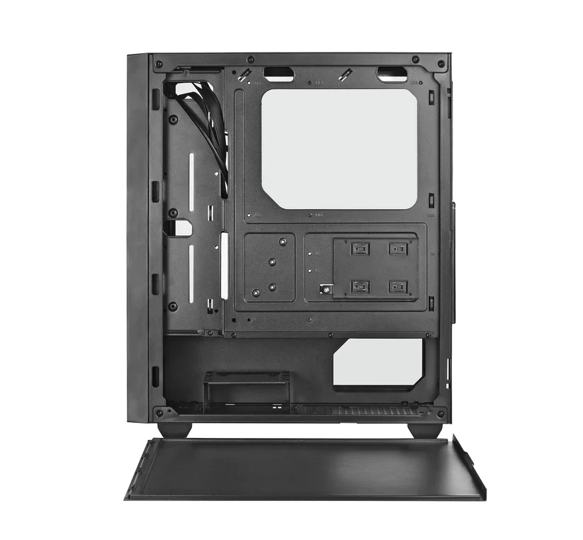 7038 je najnoviji dodatak SPIRE seriji kućišta za PC igraće računare od kaljenog stakla. Ovo kućište srednje veličine odlikuje se elegantnim i efikasnim dizajnom. Prednja strana je opremljena ABS panelom + otvorom za ventilaciju od željezne mreže i RGB svjetlosnim trakama. Lijeva strana kućišta je izrađena od visokokvalitetnog kaljenog stakla kako bi se osigurao pravilan pogled na komponente unutar kućišta.
